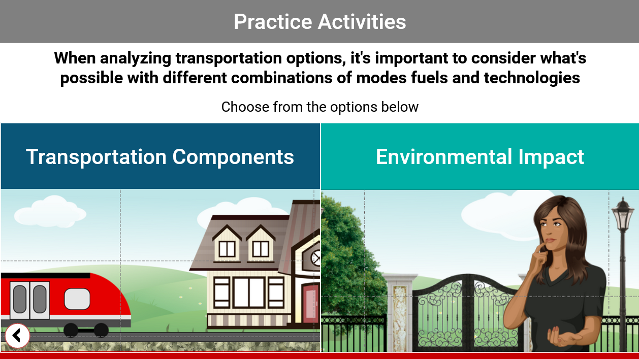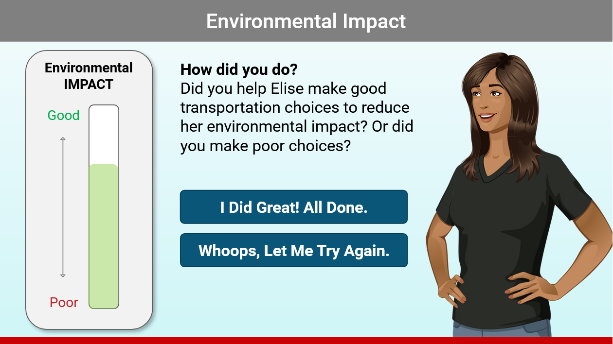 This activity asks learners to think about ways transportation choices can have an impact on the environment. Learners help Elise make good or bad choices to see how that will affect their Environmental Impact Score. Variables were used to provide immediate feedback.