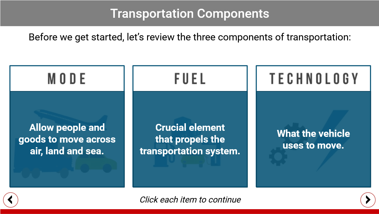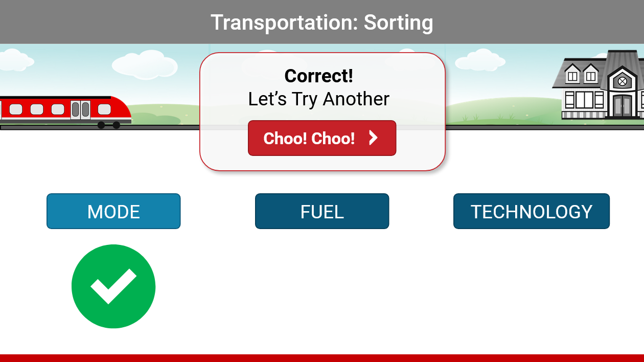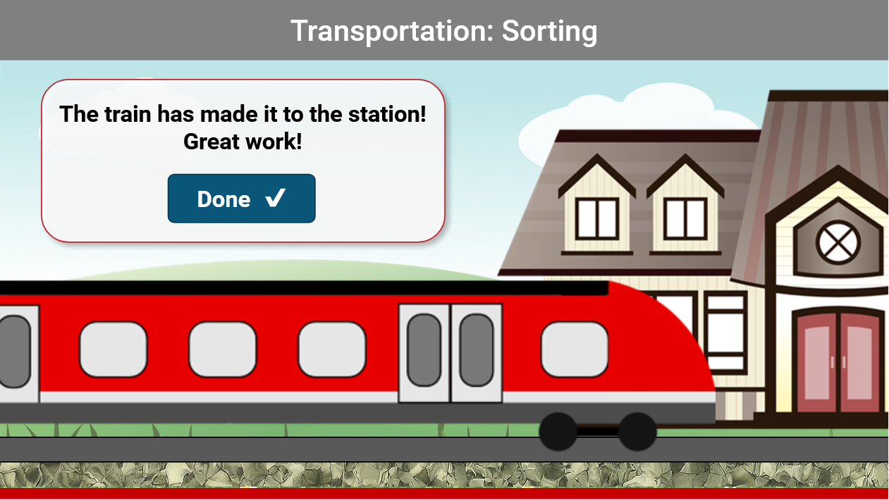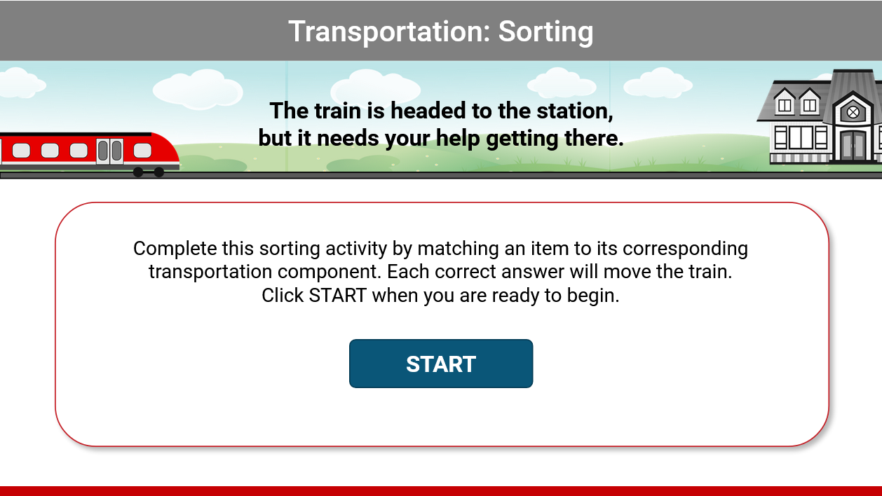 In this fun engagement, learners review the three components of transportation before they are asked to sort items into these categories. Fun, but appropriate, train graphics are used to help learners “track” their progress. Fun animations are used to motivate learners.
