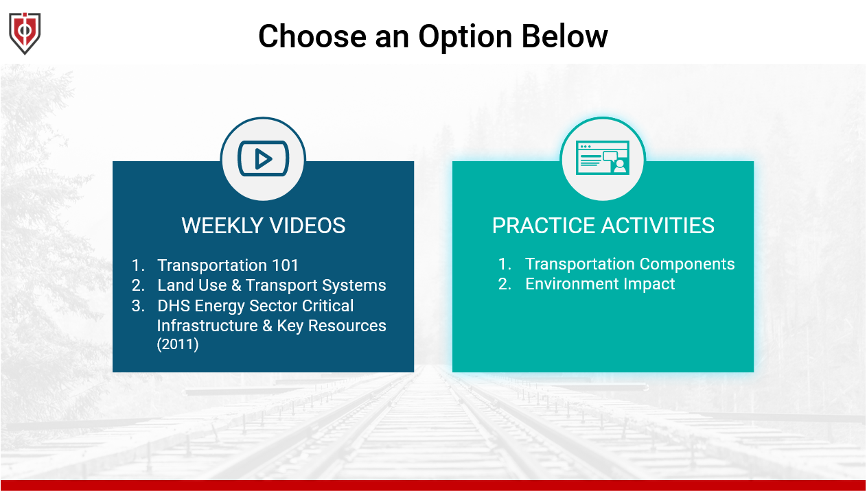 Learners are provided an opportunity to practice concepts that have been presented in videos selected to support weekly topics.
